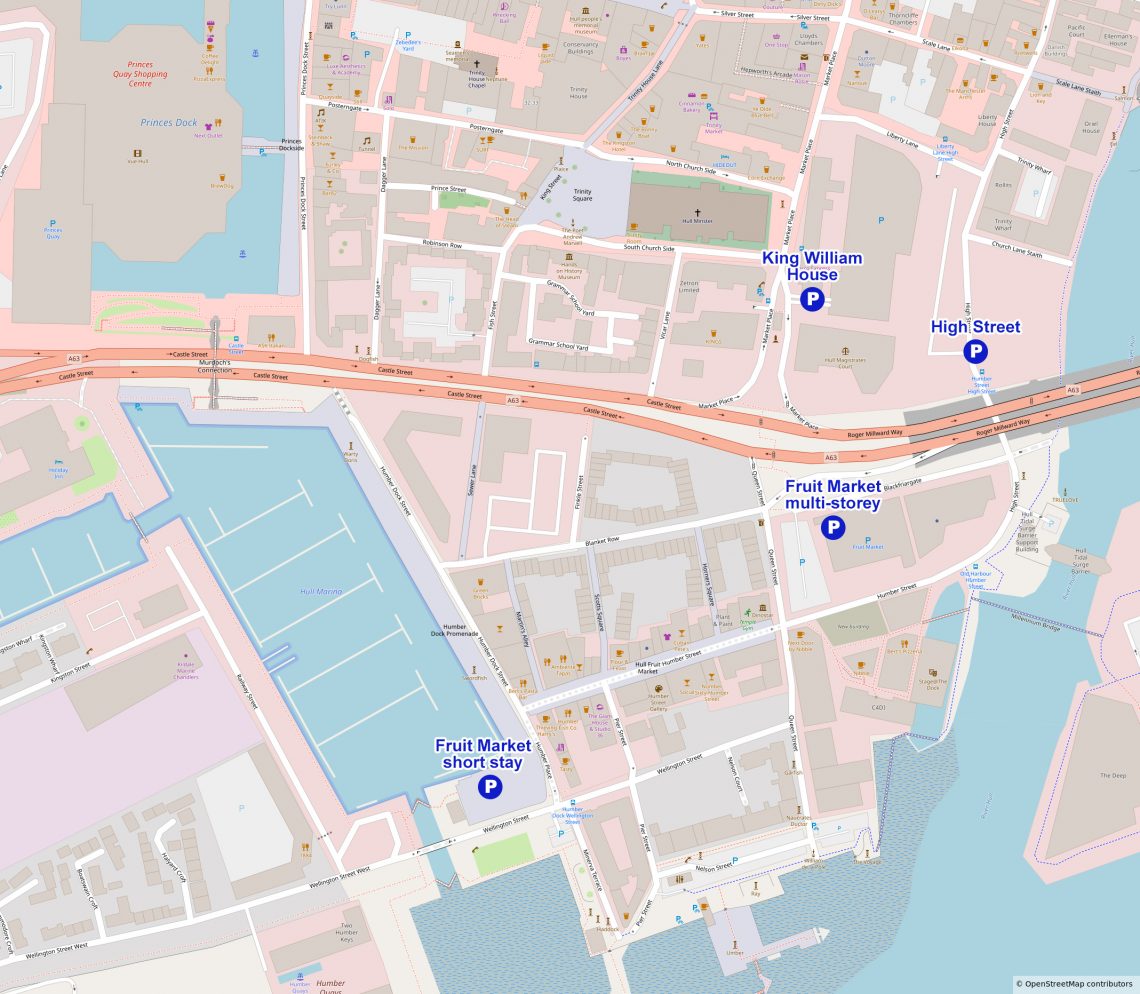 King William House car park in Market Place is another option just across the A63 (Castle Street) from the marina. It’s a multi-storey facility offering short and long-stay options, with plenty of capacity and proximity to Hull Minster and the Old Town. From there, it’s a short walk across the main road to reach the marina area. to reach the marina area. This spot is convenient if you plan to explore the Old Town pubs or attractions after visiting the Fruit Market.